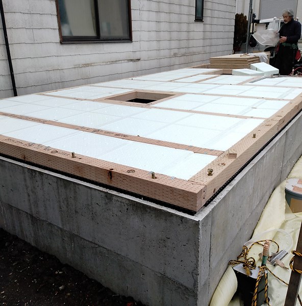 3階床合板貼り終了 ※断熱性、耐震性等について ツーバイフォー工法の住宅は、熱伝導率の低い木材を構造材に使っている上に、「モノコック構造」で高気密性を確保しています。 このため、断熱性・気密性が高いため、高性能な住まいが実現できます。 もともと床パネル・壁パネルを組み立てる方式のため、気密性を確保しやすい。それぞれの空間が独立するために、床、壁、天井が高い密閉度で接合されます。 床下から冷気が入り込む、といったすき間風による熱ロスや、断熱材の周囲に侵入した外気によって断熱効果が損なわれることもありません。 |