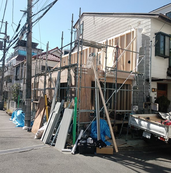 文京区Kt邸(ツーバイフォー工法・準耐火住宅) 内装工事完了後の各種器具設置し室内外クリーニング完了。 足場解体は行政による狭隘道路セットバック工事待ち。 |