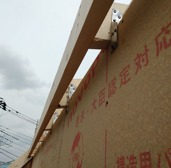 板橋区Oy邸邸(ツーバイフォー工法・準耐火住宅) 小屋組み屋根垂木掛け、及び野地合板張り終了。これで木工事躯体組み完了。 残りの構造金物等取り付け、JIO及び行政による躯体組み構造体検査の中間検査を受けます。 ツーバイフォー住宅は断熱性と気密性を高める工事がしやすい構造なので、家の中の部屋ごとの温度差が少なく、ヒートショックの影響を受けにくい体にやさしい住宅ということができます。 全て同一の構造材を使用するため、建築費の多少にかかわらず構造的な質は統一されていて安心です。 |