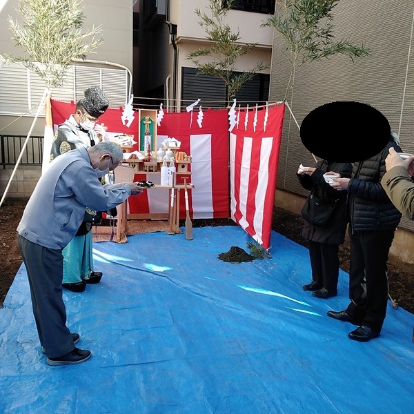 豊島区Ns邸(ツーバイフォー工法・準耐火住宅)地鎮祭・地盤改良工事後水盛遣方を出し基礎工事着手。 引き続き、基礎工事中。 ※地鎮祭とは土木工事や建築工事を始める際に吉日を選び、工事の安全を願い、その家の繁栄を祈る儀式のことです。 工事の着工にあたり、神職をお招きして神様にお供え物をし、祝詞をあげ、お祓いをして浄めた後、施主様や工事関係者が初めてその土地に鍬や鋤を入れ、榊を奉納し工事の無事を祈り、最後に全員でお神酒をいただきます。 |