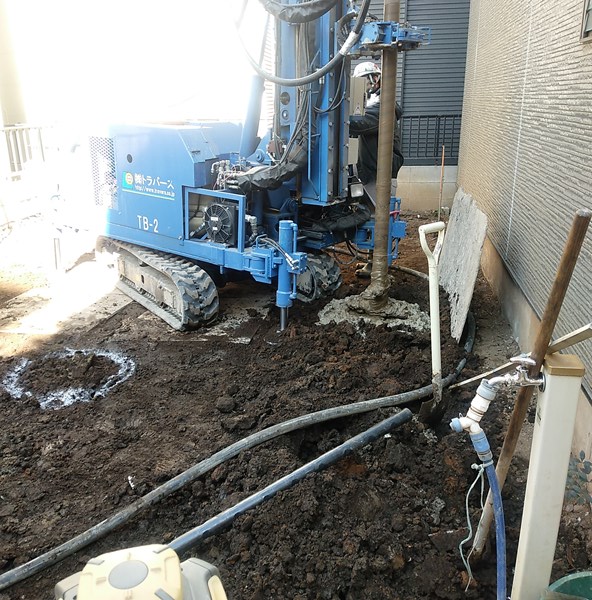 工事は鋼管杭併用柱状改良(セメントミル)としました。柱状改良とは、軟弱地盤が2メートル以上8メートル以下の深さの場合に用いられる方法で、土の中にコンクリートの柱を造ってしまうのです。 地盤の正体は外から見ただけでは判りません。不同沈下や液状化、崖崩れなど建物を脅かす被害を未然に防ぐために、地盤の状況をよく理解し、それぞれの建物に適した地盤を人工的に確保するために改良を加えることです。 地盤を含めた基礎、構造体が建物を長持ちさせ、家族の安全を守ります。当社は、常にこれを最優先に考えています。 |