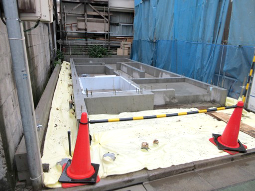 文京区Ya邸、「JIOによる配筋検査」をし、問題なく終了。 引き続き、べた基礎耐圧盤用生コンクリート打設、養生中。 現場にて生コンクリートのテストピース採取他。 ← 耐圧盤生コンクリート打設後養生中 ※ベタ基礎とは 底板一面が鉄筋コンクリートになっている基礎で、建物の荷重を底板全体で受け止め、面で支え分散させるので、不同沈下に対する耐久性や耐震性が増します。 また、地面をコンクリートで覆うので地面から上がってくる湿気を防ぎ、シロアリの侵入も防ぎます。 |