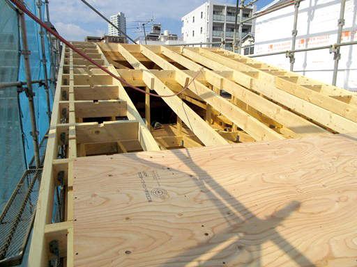 文京区Ya邸、小屋組み屋根野地合板貼りが終り、躯体組み終了。 行政による躯体検査待ち。 (画像1)屋根野地板合板貼り終了 |