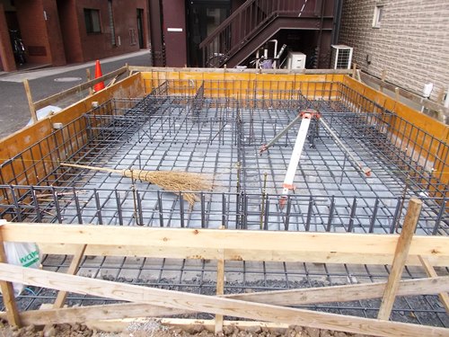 文京区As邸、引き続き基礎工事、砕石転圧地業後、防湿シート敷き込み、捨てコンクリート打設。 ※その際、地鎮祭の折、神主より賜った「鎮物」を建物中央部に納め、家の守り神になっていただきます。 引き続き外周の立ち上がり型枠を組み後、配筋(鉄筋組み)工事終了。 |