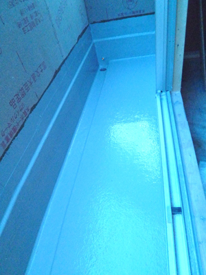 ベランダのFRP防水工事も完了し、これで雨水の侵入が防げ、断熱工事に支障なし。 |