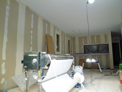 中央区Y邸、天井、壁、石膏ボードジョイント部分、内装下地パテ処理中。 クロスの仕上がりに影響を与える大事な作業です。 |
