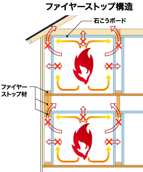 ←2階躯体壁組み終了 木造枠組み壁工法は耐力壁と剛床を強固に一体化した箱型構造であり、フレーム状に組まれた木材に構造用合板を打ち付けた壁や床(面材)で支える。そのため、高い耐震性・耐火性・断熱性・気密性・防音性をもっています。 ※耐火性:火の通り道となる床や壁の枠組み材などがファイヤーストップ材となっていることが特徴です。 これにより、空気の流れを遮断して上階へ火が燃え広がるのをくい止めます。 |