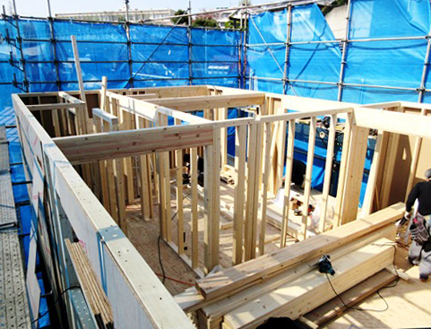 北区Om邸(ツーバイフォー住宅)1階躯体壁組み終了間近。 引き続き2階床組み躯体工事進行中。 (画像1)1階躯体壁組み終了間近 ※ツーバイフォー工法について ツーバイフォー工法は壁、床、天井などの六面体の面全体で家を支えるため、正式には「枠組壁工法」と言います。 特徴として耐力に優れた枠材と面材とが一体となり、面で支える構造のため、外力を建物全体で受け止め、その荷重を一点に集中させることなく、分散させるために、建物全体で地震等に強さを発揮します。 また、断熱性と気密性を高める工事がしやすい構造なので、家の中の部屋ごとの温度差が少なく、ヒートショックの影響を受けにくい体にやさしい住宅ということができます。 全て同一の構造材を使用するため、建築費の多少にかかわらず構造的な質は統一されていて安心です。 |