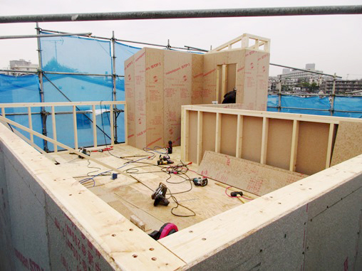このため、断熱性・気密性が高いため、高性能な住まいが実現できます。 もともと床パネル・壁パネルを組み立てる方式のため、気密性を確保しやすい。 それぞれの空間が独立するために、床、壁、天井が高い密閉度で接合されます。 床下から冷気が入り込む、といったすき間風による熱ロスや、断熱材の周囲に侵入した外気によって断熱効果が損なわれることもありません。 ツーバイフォー住宅の外壁は、構造用面材を貼った大壁構造のために、枠組材の間に空気層をつくります。 断熱材はその空気層に充填するため施工も容易です。 (画像2)3階床合板貼り終了後壁組み (画像3)3階床根太組み終了 |