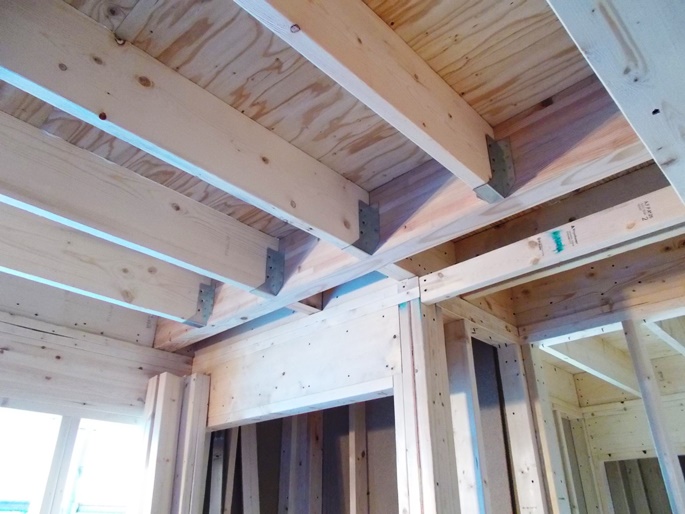 三鷹市Mo邸(ツーバイフォー住宅地下室RC造付き2階建て住宅)2階小屋裏床完了後屋根垂木掛け、野地合板張り完了。 引き続き構造用金物の取付けで躯体組み終了。 近日、第三者機関JIOによる構造体検査を受けます。 ツーバイフォー住宅は断熱性と気密性を高める工事がしやすい構造なので、家の中の部屋ごとの温度差が少なく、ヒートショックの影響を受けにくい体にやさしい住宅ということができます。 全て同一の構造材を使用するため、構造的な質は統一されていて安心です。 |