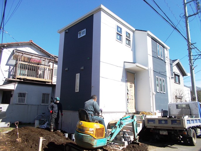 三鷹市Mo邸(RC造地下室付きツーバイフォー住宅)足場解体後、外部給排水工事。 |