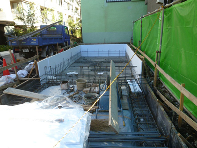 中野区H邸、ベタ基礎外型枠組み立て、及び深基礎のため基礎断熱材を採用。鉄筋組み(配筋)が終了しJIOによる配筋検査を受ける。建物の耐久性や強度に直接影響するため重要な検査です。 JIOによる配筋検査 ※配筋(それぞれの鉄筋が寸法、数量、種別など正しく組まれている事) ※配筋検査(コンクリートを打ち込む前に、正しく鉄筋が配置されているかを確認する事) |