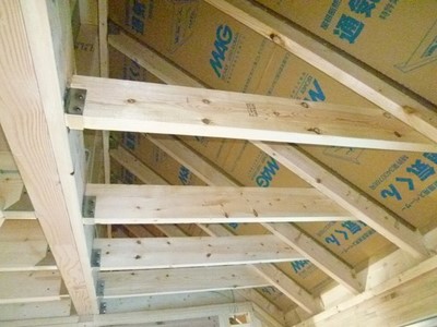 中野区H邸、構造体検査終了後、屋根からの熱を小屋裏に取り込まないように断熱材吹き付け用下地を取り付け、通気層を確保。その後、発泡ウレタンを外壁面及び小屋裏一体に吹き付け、断熱工事終了。 現場での発泡吹付けのため、隙間無く断熱材が施工できるので気密性が高く、室内の温度差が少なくなり、結露の発生を防ぎます。断熱工事と気密工事が同時にできるので、木材は常に乾燥状態を維持し、建物を長持ちさせます。 小屋裏発泡ウレタン吹付け |