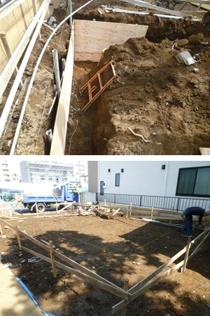 渋谷区Na邸、地鎮祭終了後、地盤改良を施し基礎工事着工。 水盛り遣り方を出し深基礎部山留をし安全を確保したのち着手。 根伐り終了後、砕石地業及び転圧、防湿シート敷き込み、引き続き基礎工事。 ←根伐り終了、防湿シート敷き込み ※水盛り遣り方とは 建物の位置や基礎の高さを示すために、基礎の仕上がりの外側に打った木の杭に、板を取り付け、板と板の間に水平に水糸を張ります。 その水糸が、基礎(建物)の中心線となりますが、これは、基礎工事終了後には取り除かれます。 ※山留めとは 掘削に際して、根切り側面を保護したり、土砂の崩壊や湧水を防いだり、近接する既存構造物の安全を確保したりすることを山留めといいます。 また、そのために設置されるもののことも山留めと呼びます。 ※根伐りとは 土を掘削して必要な基礎空間を造る作業で、砕石地業や捨コンクリートが打設できるよう根切り底を所定の深さに掘り揃え平坦にする作業のことをいう。 ※転圧することによって砕石の沈み込みを防止。転圧後のレベル(高さ)確認は必ず行ないます。 ※防湿シート敷き込み(湿気や水蒸気を防ぐために砕石の上にフィルムを敷く作業 |