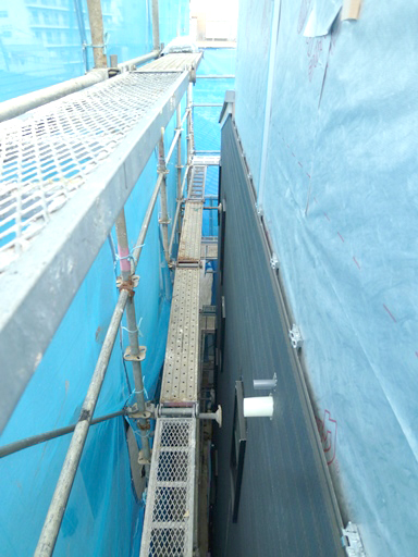 渋谷区Na邸、外壁サイディング貼り後、雨樋、バルコニー笠木取り付け等、足場が必要な工事が終了したので解体。 ← 足場解体 |