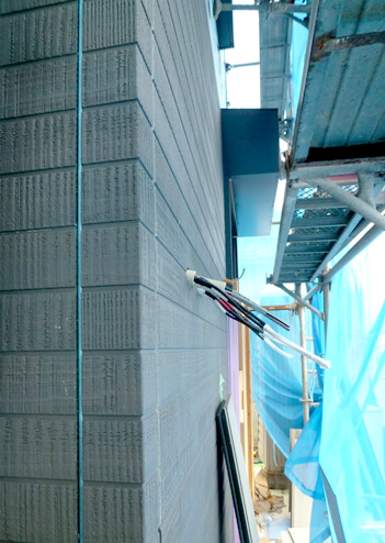← 外壁サイディング貫通部コーキング処理 外壁サイデングボードとボードの境目にある継ぎ目を「目地(めじ)」と言いますが、サッシや外壁を貫通している電気配線等の周りには、コーキング処理(シール)がなされます。これは、はじめは柔らかいのり状ですが、時間が経つにつきゴム状に固まります。 (外壁貫通部防水処理手順は、躯体壁⇒タイベックシルバー貼り⇒外壁サイディング貼り) |