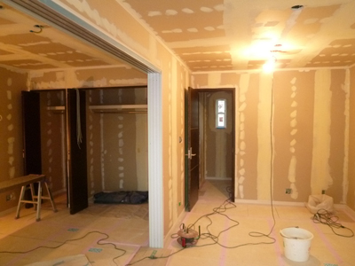 渋谷区O邸、内装(クロス貼り)工事終了。 今後、電気(スイッチ、コンセント、照明器具、エアコン等)、給排水衛生設備工事(トイレ器具・洗面化粧台等)取り付け。 |