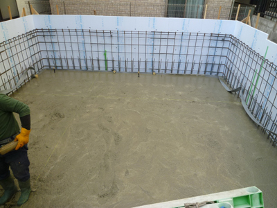 品川区F邸(半地下室付き住宅)外周立ち上がりの断熱材施工後鉄筋組みも終了し、JIOによる配筋検査を受け問題がなかったため、耐圧盤生コンクリートを打設。 立ち上がり接合部より外部の水が室内に入らないよう止水板を埋め込み中。 |
