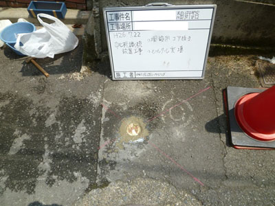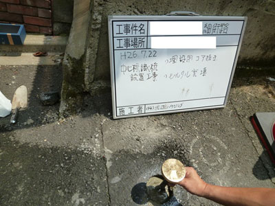 新宿区E邸、長期間打ち合わせを重ね、やっと決まりました。 建築地使用道路が、自治体によって細街路(狭あい道路・2項道路)と呼ばれ建築主と行政とで話し合い、公共事業として道路拡幅整備ができる事になりました。その道路後退する境を決めるため、中心標識杭を設置終了。 コア抜き |