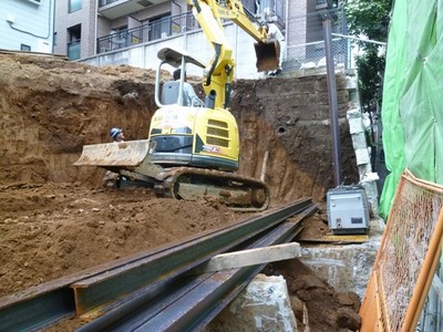 新宿区E邸、既存の擁壁撤去終了。 既存の擁壁に代わり新規擁壁を作る際、隣地周辺の土が崩れない様にするための「山留め」作業中。 |