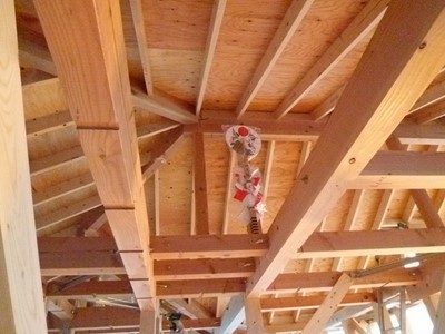 新宿区E邸(在来軸組工法)行政の指導により新規に擁壁を造り、地盤改良、基礎工事へと進み、この度無事上棟しました。引き続き、工事完了に向け、作業の安全を徹底していきます。 *幣串とは、上棟式に家のお守りとして御札と共に上げる祝い柱で、南に向けるのが一般的とされています。 上棟祝い柱(幣串) |