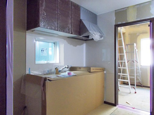 (画像2)パテ塗り(2)及びシステムキッチン据え付け 内装の石膏ボードも下地処理をしっかり行わなければ、クロスの仕上がりが満足いくものではなくなってしまいます。 大まかな部分を埋めるパテは、やせが少ないが目が粗い特徴があります。 そのため、この際行うパテ処理と一番最初に行ったパテは目が粗いパテになります。 そして最後に仕上げ用のパテを行います。 このパテは目が細かいです。 先ほどのパテでは、目が粗くそのままではきれいなフラットな仕上がりになりません。 よって、完全なフラットな状態にするために仕上げ用の目の細かいパテで下地処理の仕上げを行います。 その後サンドペーパーを使い、完全なフラットな面に仕上げます。 パテは硬いペースト状の充填材で、炭酸カルシュウムや石膏の粉末や樹脂を混ぜてペースト状にしたもの。 |