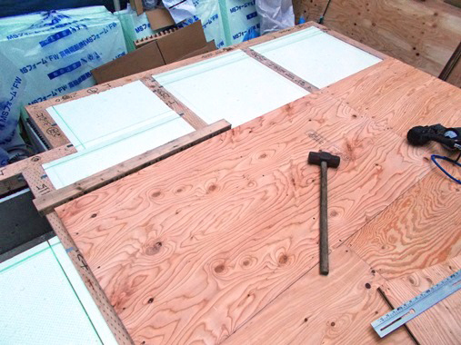 (画像1)ルーフバルコニー床合板貼り 杉並区Ta邸(ツーバイフォー住宅)2階壁組み後、ルーフバルコニー(屋上バルコニー) 及び天井根太取り付け後、床合板貼り。引き続き躯体工事進行。 |