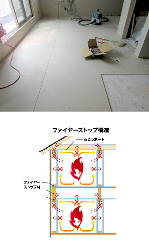 ←準耐火のため、2階床石膏ボード敷き込み ↓ ファイヤーストップ構造 |