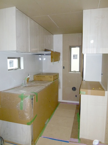 豊島区Ka邸、外壁サイディング貼り後、雨樋取り付け等、足場が必要な工事が終了したので解体。 また、内部ではシステムキッチン設置済み。 ←足場解体 外壁サイデングボードとボードの境目にある継ぎ目を「目地(めじ)」と言いますが、この場所や窓などのサッシ及び外壁を貫通している電気配線他の周りには、コーキング処理(シール)としてゴム状のものが埋め込まれます。はじめは柔らかいのり状ですが、時間が経つにつきゴム状に固まります。 |