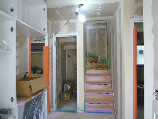 豊島区Ka邸、内装クロス貼り及び玄関ポーチ床タイル貼り進行中。 近日終了予定。 引き続き、設備器具等取り付け。 (UB・システムキッチンセットは据付け済) ←リビング・クロス貼り |